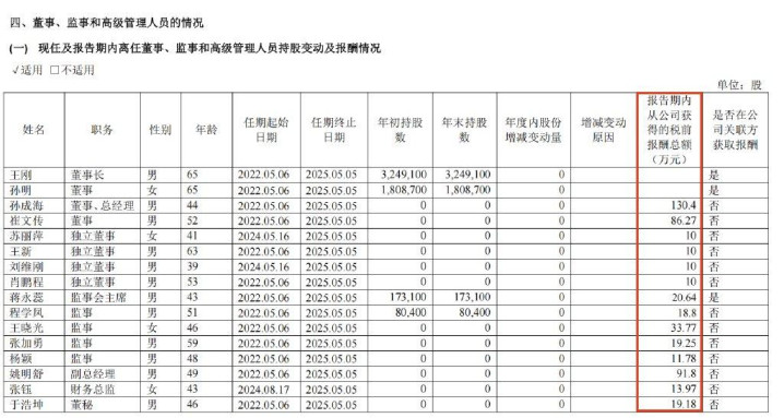 2024年年报显示,董事、总经理孙成海的薪酬由2023年的71.47万元,大幅上涨到了2024年的130.4万元,涨幅约82.45%;董事崔文传的薪酬由2023年的57.88万元上涨至了86.27万元,涨幅49%;副总经理姚明舒2023年的薪酬为68.05万元,2024年其薪酬为91.8万元,涨幅34.9%;董秘于浩坤2023年薪酬为14.23万元,2024年上涨至19.18万元,涨幅34.79%。此外,金晶科技多名监事的薪酬也在2024年上涨了1万元至8万多元不等。
